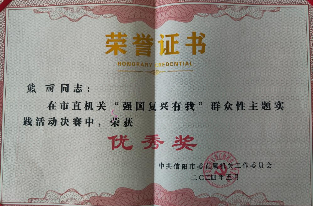 4月24日,市直機(jī)關(guān)“強(qiáng)國(guó)復(fù)興有我”群眾性主題實(shí)踐活動(dòng)決賽在信陽(yáng)博物館舉行,市直各單位共60名選手參賽。經(jīng)過(guò)激烈比拼,華信建投集團(tuán)榮獲“優(yōu)秀組織獎(jiǎng)”,熊麗同志榮獲“優(yōu)秀獎(jiǎng)”。